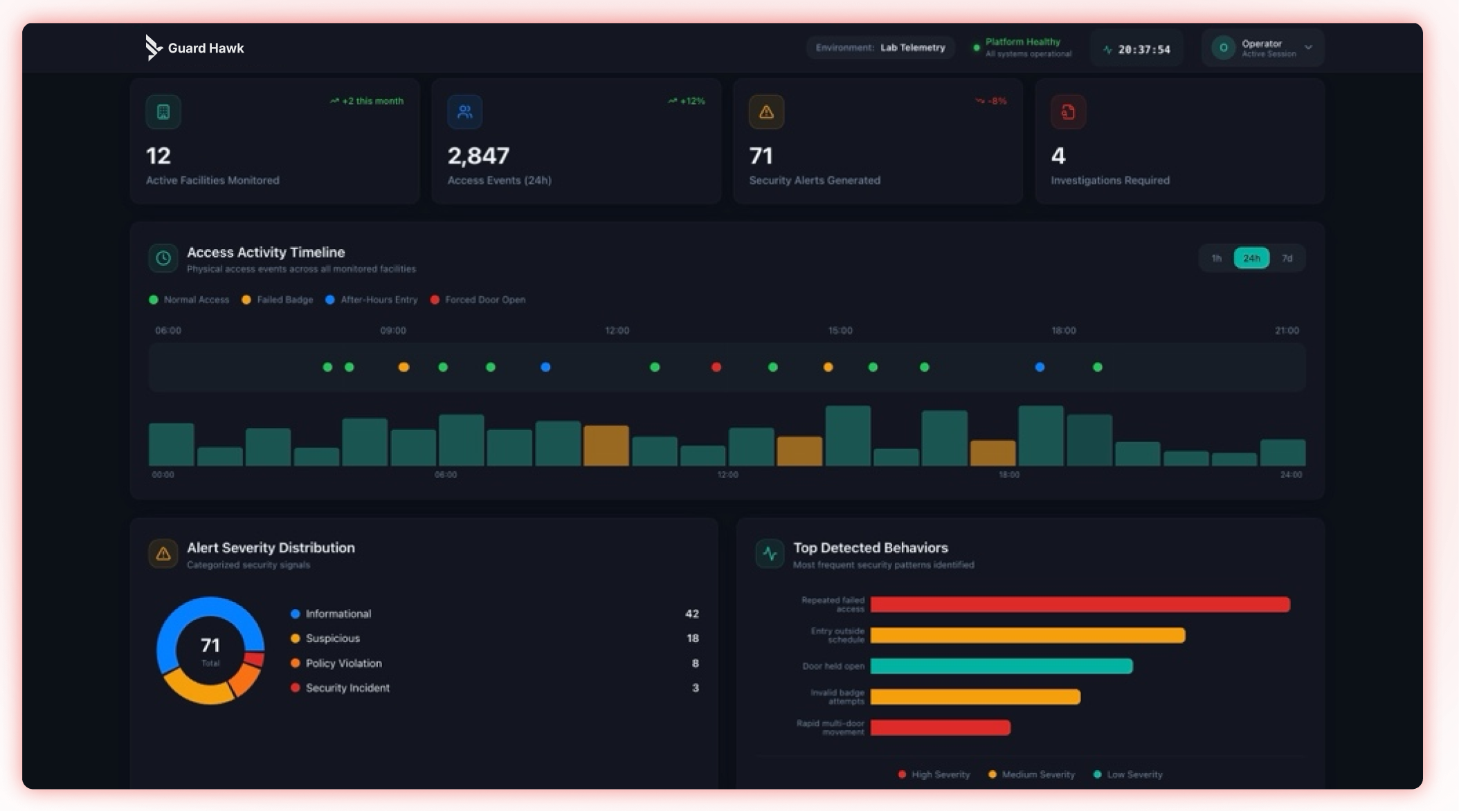 Most security tools monitor systems in isolation. Guard Hawk connects physical access, identity, and infrastructure signals to detect threats others miss - before they escalate.